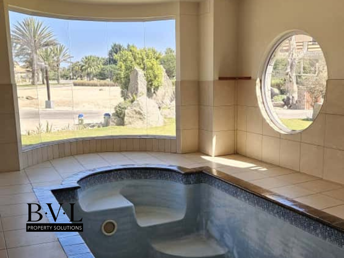 Resort-style family and investment living in Rossmund Golf Estate, Swakopmund, with under-roof heated pool and sauna, expansive entertaining areas, guest flat and five garages.